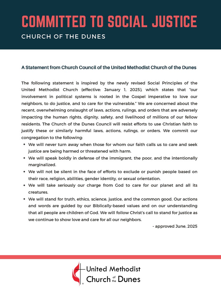 The following statement has been issued by Church of the Dunes church council on the church’s commitment to social justice.